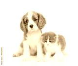 Cavalier King Charles Spaniel sits with tiny kitten. isolated on white background