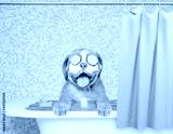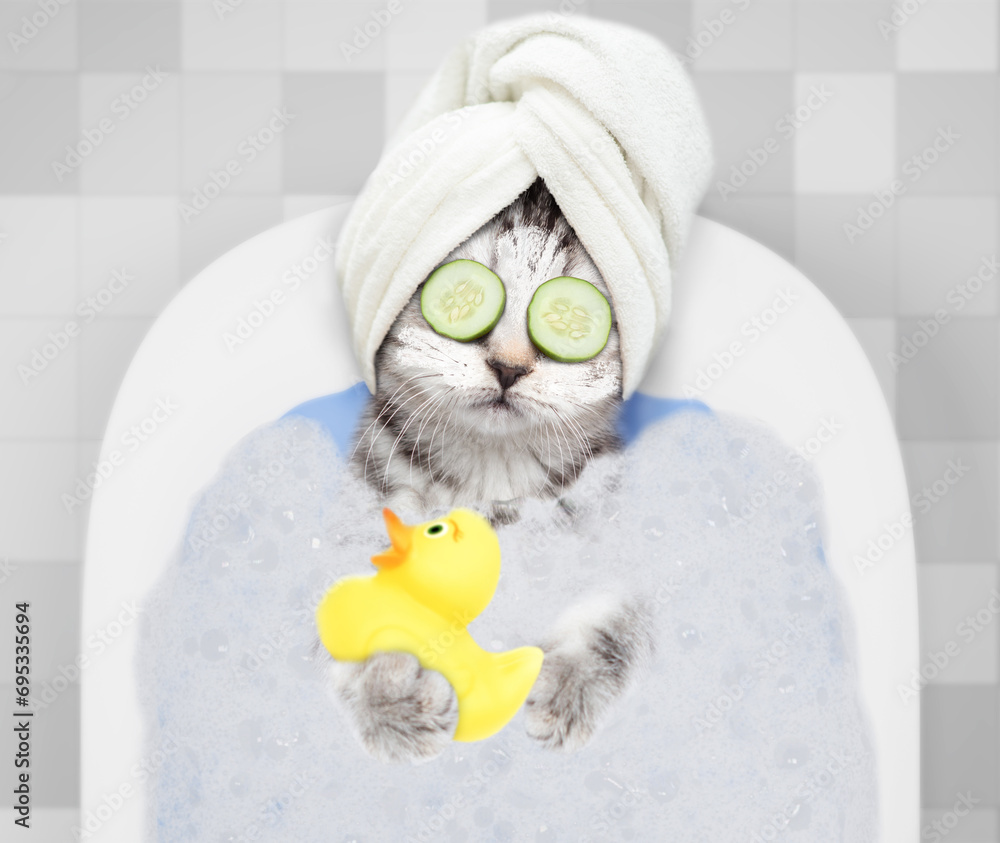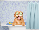 Happy Mastiff puppy with pieces of cucumber with cream on it face takes the bath at home