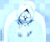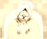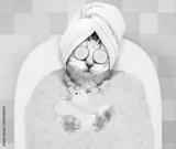 Cute kitten with towel on it head, with pieces of cucumber on it eyes and with cream on it face takes the bath at home with rubber duck. Top down view