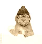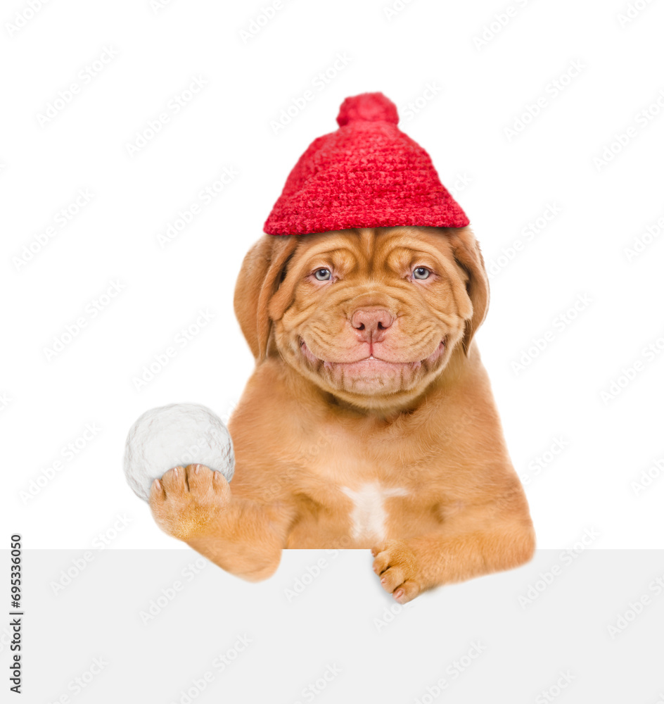 Smiling mastiff puppy wearing warm winter knitted woolen hat with pompon holds snowball above empty white banner. Isolated on white background