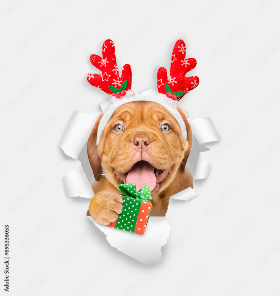 Happy Mastiff puppy dressed like santa claus reindeer Rudolf holds gift box and looks through torn white paper hole. Empty free space for mock up
