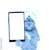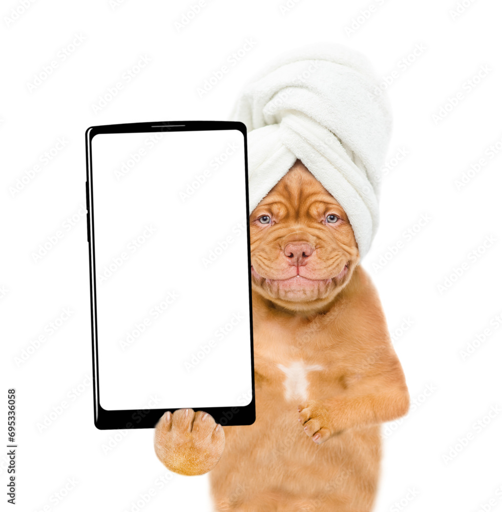 Smiling Mastiff puppy with towel on it head shows big smartphone with white blank screen in it paw. isolated on white background