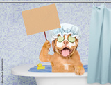 Happy Mastiff puppy wearing shower cap with cream and slices of cucumber on it face takes the bath at home and shows empty placard