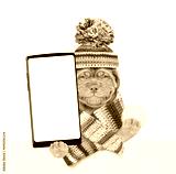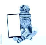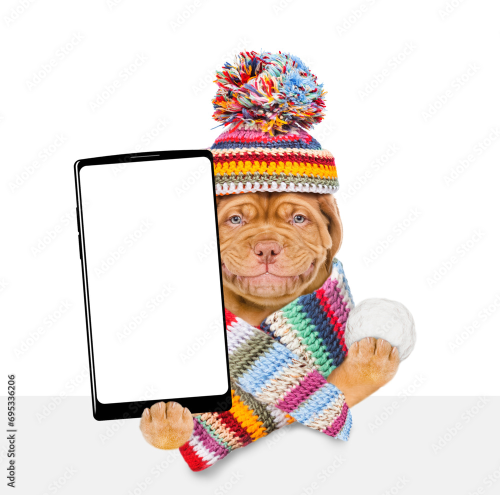 Happy puppy wearing a warm hat with pompon and knitted woolen scarf holds snowball and holds smartphone with white blank screen in it paw above empty white banner. isolated on white background