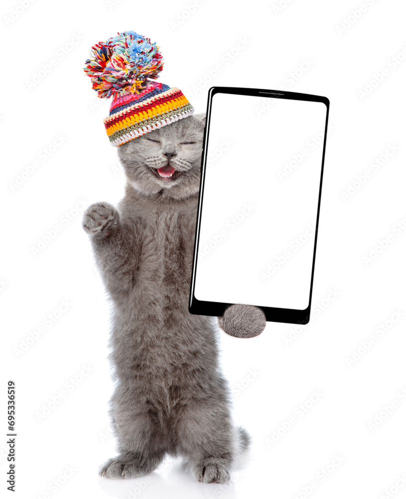Happy cat wearing warm knitted hat with pompon holding smartphone with white blank screen in it paw. Isolated on white background
