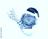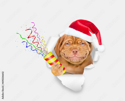 Smiling Mastiff puppy wearing santa hat looks through the hole in white paper and holds exploding firecracker