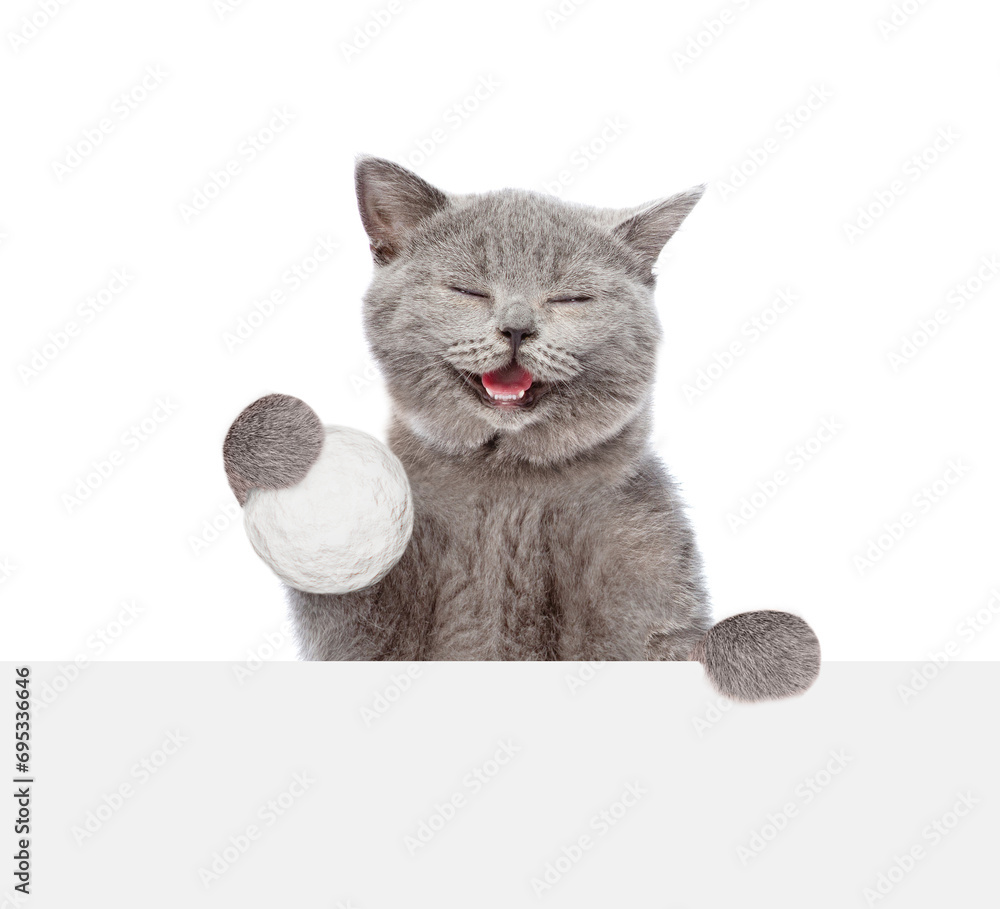 Happy cat holds snowball above empty white banner. Isolated on white background