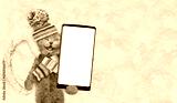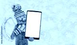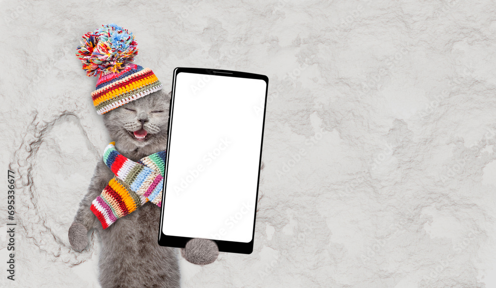Happy cat wearing warm knitted hat with pompon and woolen scarf making snow angel while lying on snow and holding smartphone with white blank screen in it paw. Empty space for text
