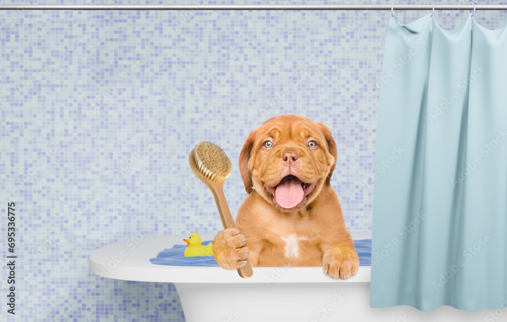 Happy Mastiff puppy takes the bath at home and holds shower brush. Empty space for text