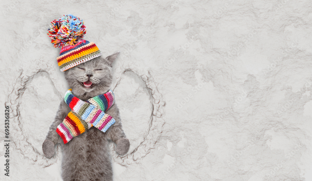 Happy cat wearing warm knitted hat with pompon and scarf making snow angel while lying on snow. Empty space for text