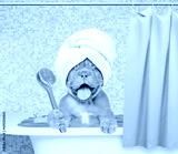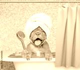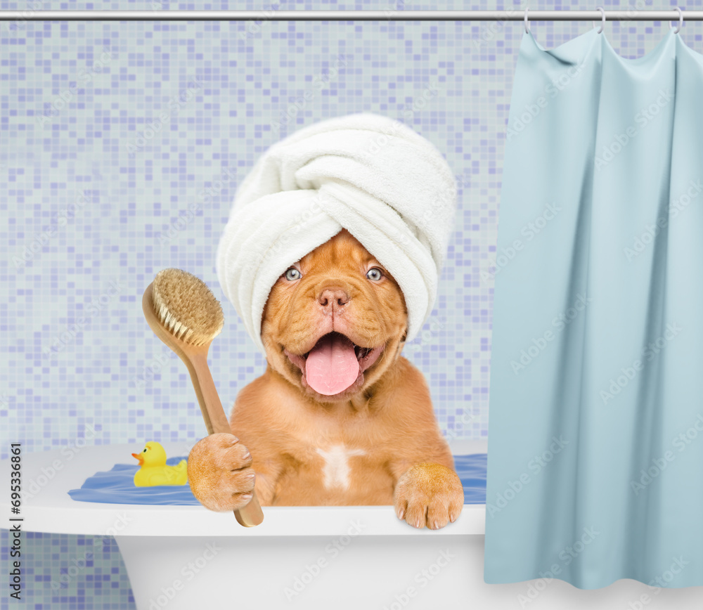 Happy Mastiff puppy with towel on it head takes the bath at home and holds shower brush