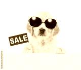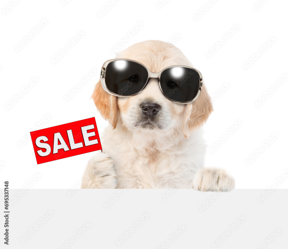 Funny Golden Retriver puppy wearing sunglasses holds signboard with labeled "sale" above empty white banner. isolated on white background