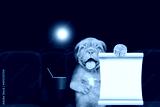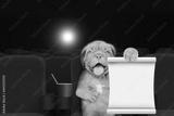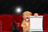 Happy Mastiff puppy watching a movie in the cinema and shows empty list