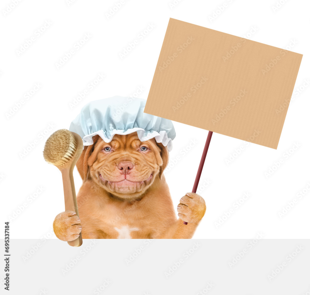 Funny Mastiff puppy wearing shower cap holds shower brush and empty placard above empty white banner. isolated on white background