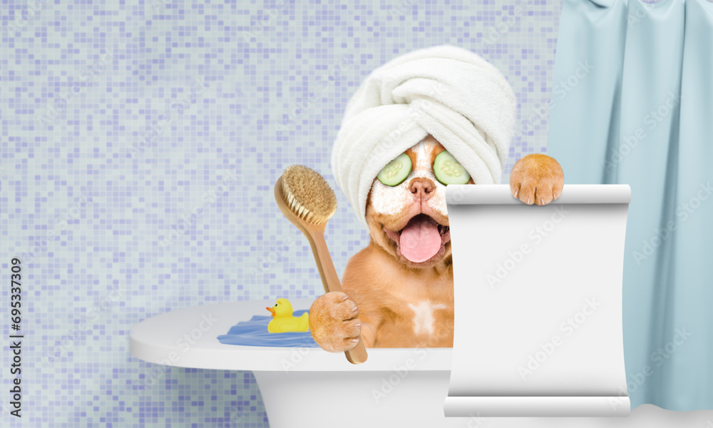 Happy mastiff puppy with towel on it head, with pieces of cucumber on it eyes and with cream on it face takes the bath and shows empty list at bathroom at home. Empty space for text
