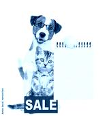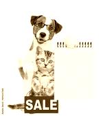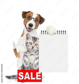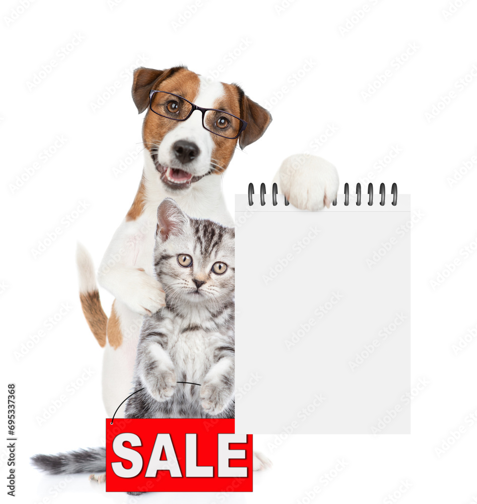 Smart Jack russell terrier puppy hugs tabby kitten and shows empty list. Cat shows signboard with labeled "sale". isolated on white background