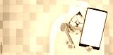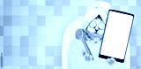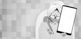 Cute kitten with towel on it head, with pieces of cucumber and with cream on it face takes the bath at home and shows big smartphone with white blank screen in it paw. Top down view. Empty space