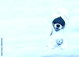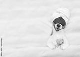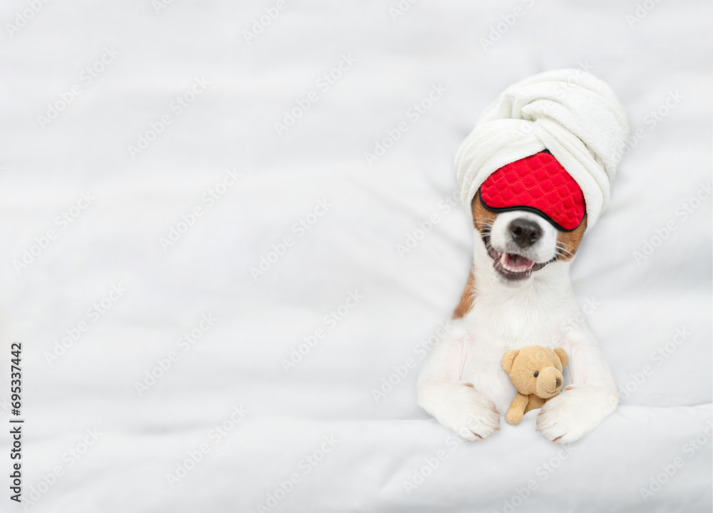 jack russell terrier puppy wearing towel on it head and sleeping mask sleeps with toy bear under white blanket on a bed at home. Top down view. Empty space for text