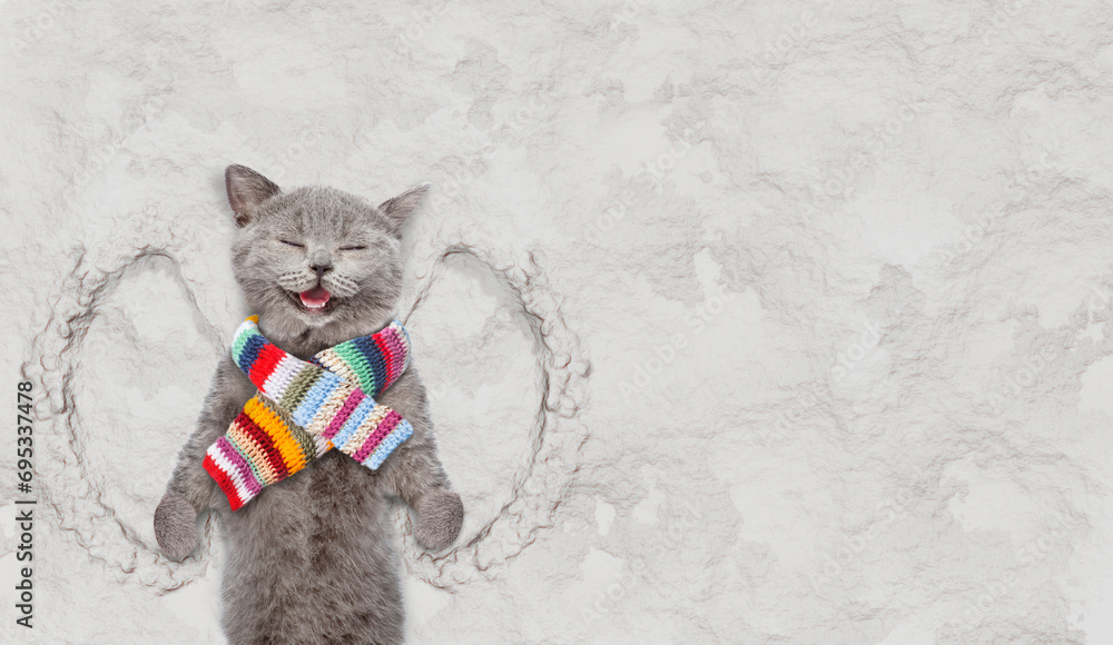 Happy cat wearing warm knitted scarf making snow angel while lying on snow. Empty space for text