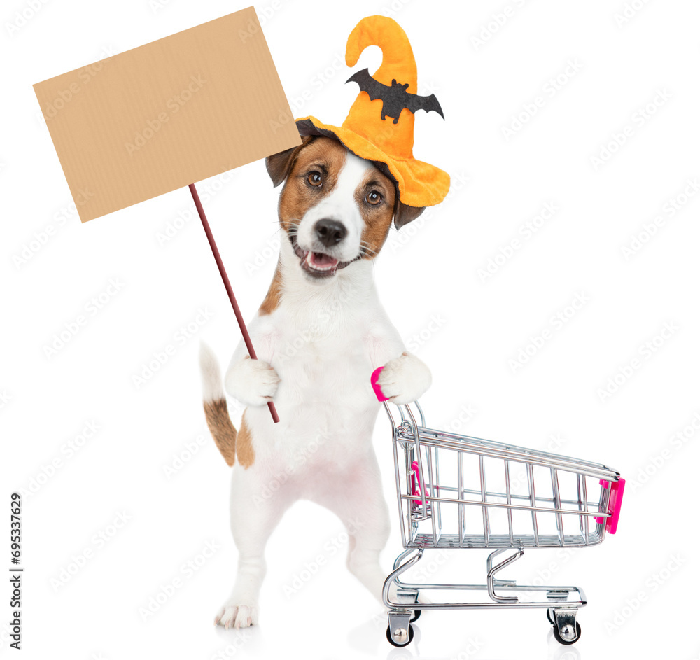 Jack russell terrier puppy wearing hat for halloween holding the shopping cart and shows empty placard. isolated on white background