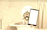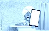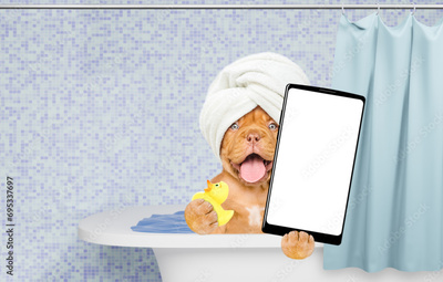 Happy Mastiff puppy with towel on it head takes the bath, holds rubber duck and shows big smartphone with white blank screen in it paw. Empty space for text
