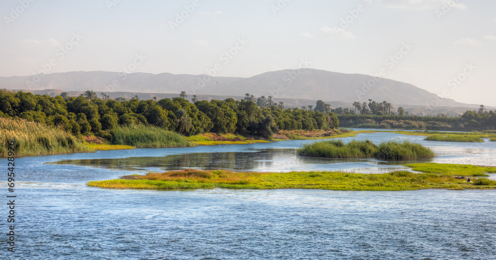 Scenic view of nile river with palm trees and blue sky at background - Landscape on the Nile, fishing boat, Nile bank, Egypt