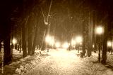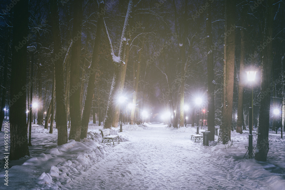 Winter night park with trees, glowing lanterns and benches covered with snow. Vintage film aesthetic.
