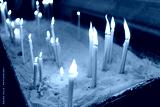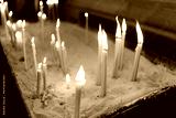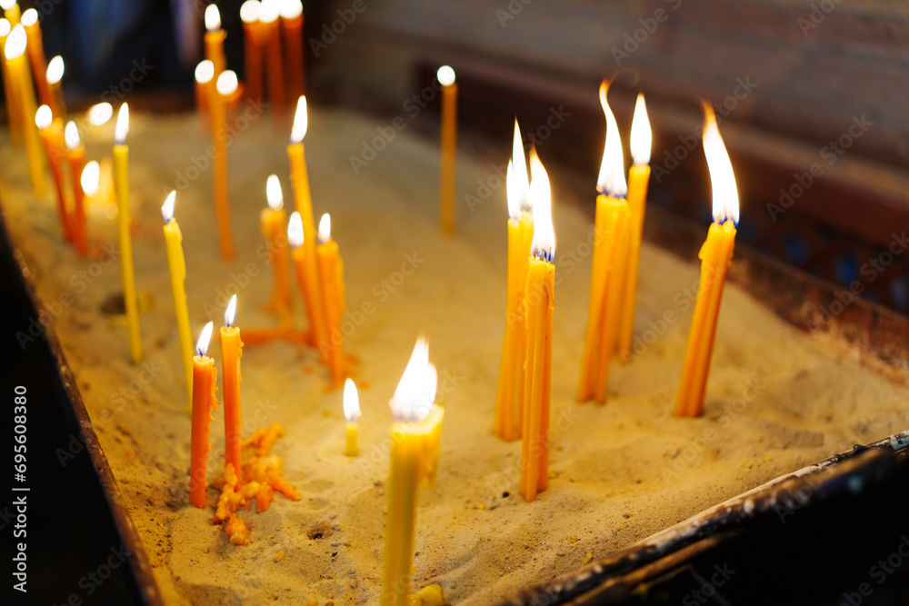 Burning candles standing in the sand in the church.
