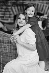 Mother and daughter cuddling in a room by the fireplace in elegant dresses