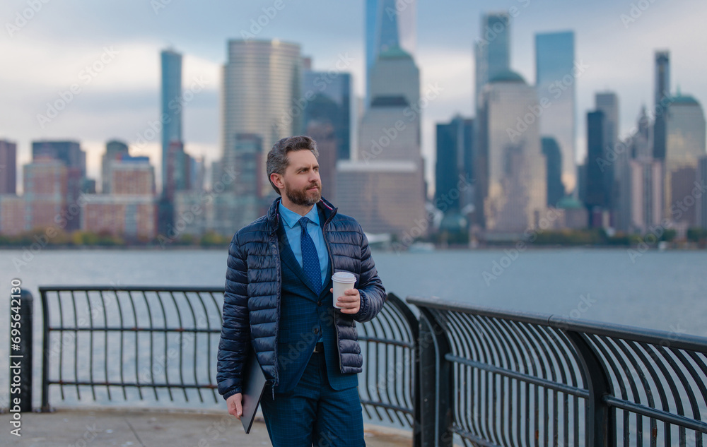 Handsome businessman in NYC. Outdoor business. Serious businessman standing against skyscraper in New York, at Manhattan. Professional employee waiting for business partners outdoors.