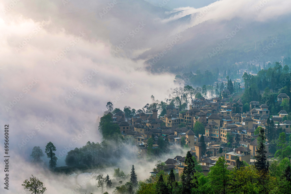 The cottage in the morning fog of Ailao Mountain, Yuanyang County, Honghe Prefecture, Yunnan Province, China.