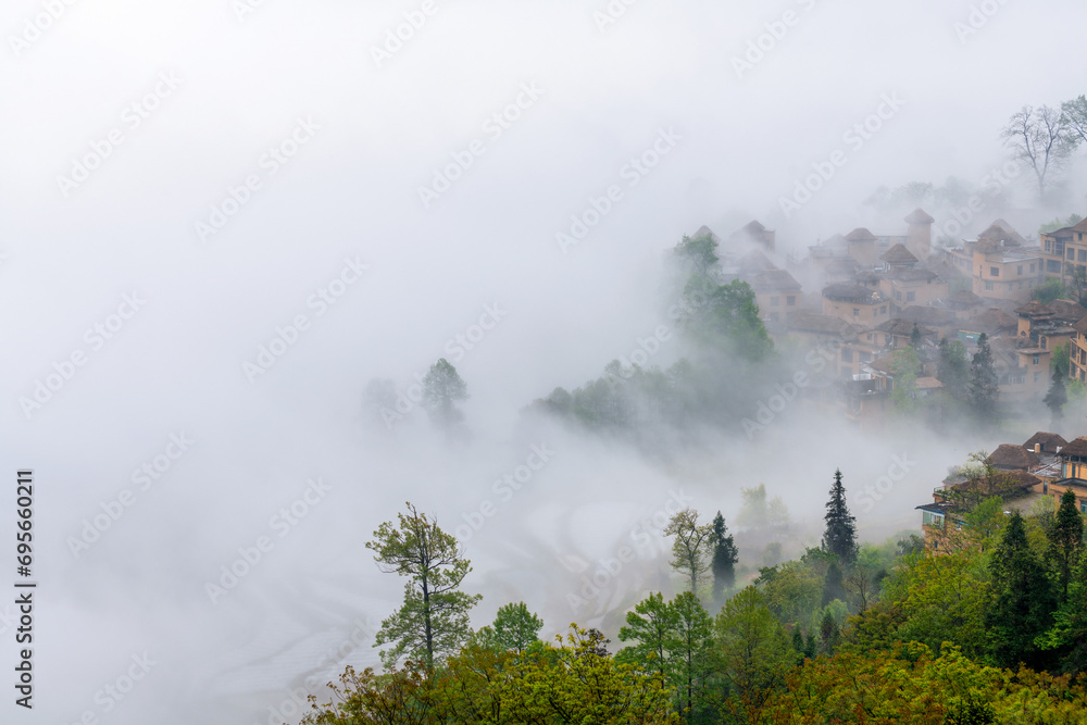 The cottage in the morning fog of Ailao Mountain, Yuanyang County, Honghe Prefecture, Yunnan Province, China.