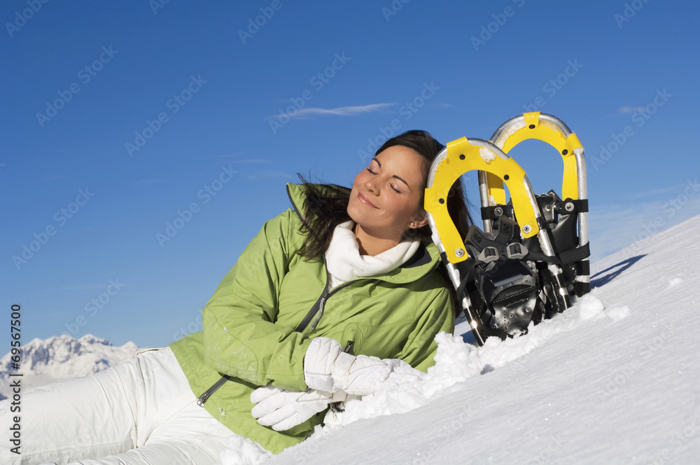 Frau liegt im Schnee , stützte sich auf Schneeschuhen