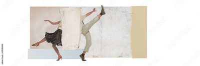 Young man and woman cheerfully dancing over pastel background. Social dance club. Contemporary art collage. Concept of retro style, dancing activity, entertainment, party. Poster. Paper effect