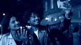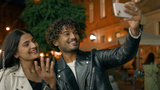 Indian Arabian couple love guy girl woman man friends boyfriend girlfriend night evening city urban talking mobile phone webcam video call record conference vlog blog smiling laughing greeting hello