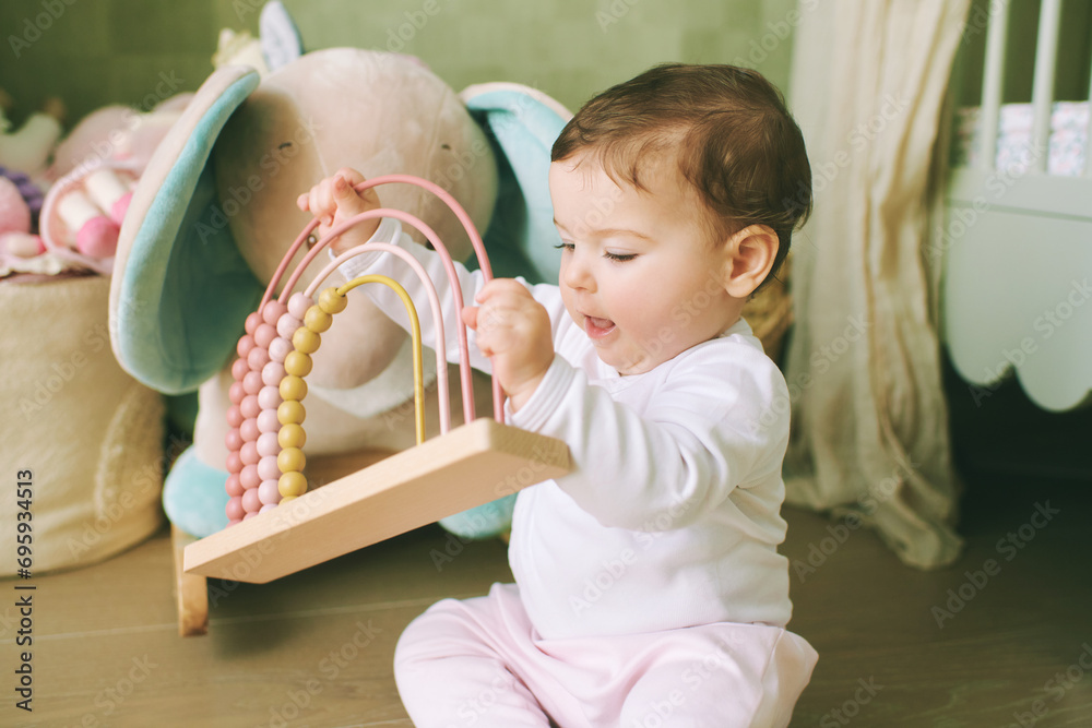 Portrait of adorable 9 months old baby girl playing at home with educational toys
