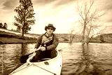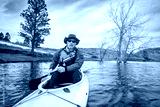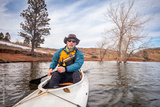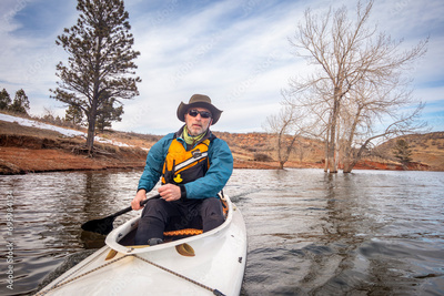senior male in life jacket is paddling expedition canoe, cold season scenery on Horsetooth Reservoir in northern Colorado, POV from action camera