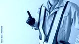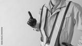 指差しポーズをする作業服の男性|建設業・警備員・ガードマン イメージ
