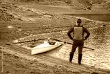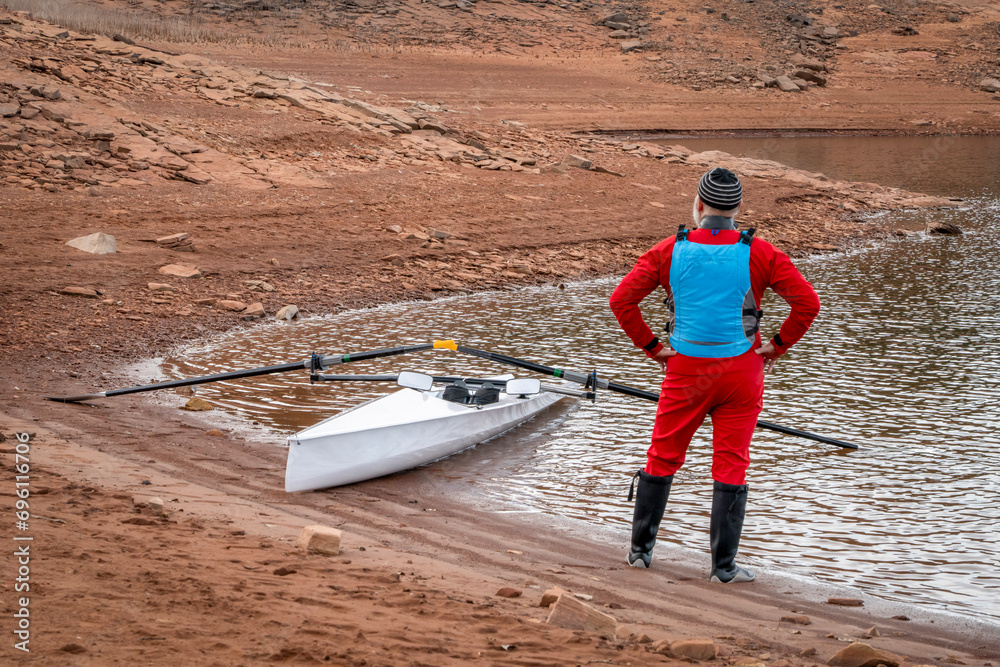 Senior male rower wearing drysuit with a coastal rowing shell on a shore of Horsetooth Reservoir in fall or winter scenery.