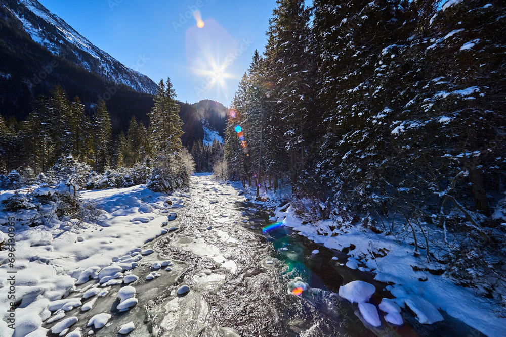 Winterimpressionen im Gegenlicht an den Krimmler Wasserfällen und der Krimmler Ache. Salzburger Land, Österreich.