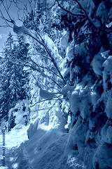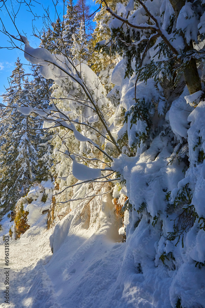 Schön verschneiter Bergwald in Österreich, Nahaufnahme.