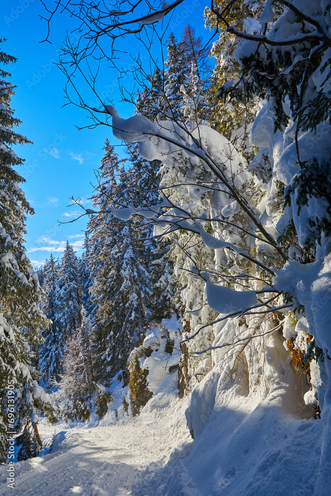 Schön verschneiter Bergwald in Österreich, Nahaufnahme.