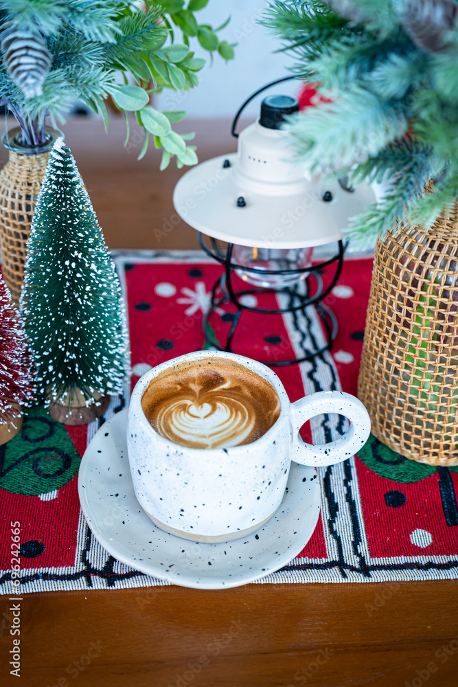 Close up of Hot coffee latte with latte art milk foam in cup mug with Xmas decors and Xmas tree baubles on wood desk Celebrating Merry Christmas and New year.