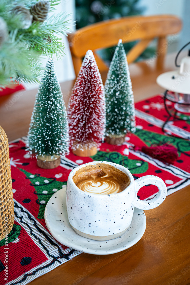 Close up of Hot coffee latte with latte art milk foam in cup mug with Xmas decors and Xmas tree baubles on wood desk Celebrating Merry Christmas and New year.