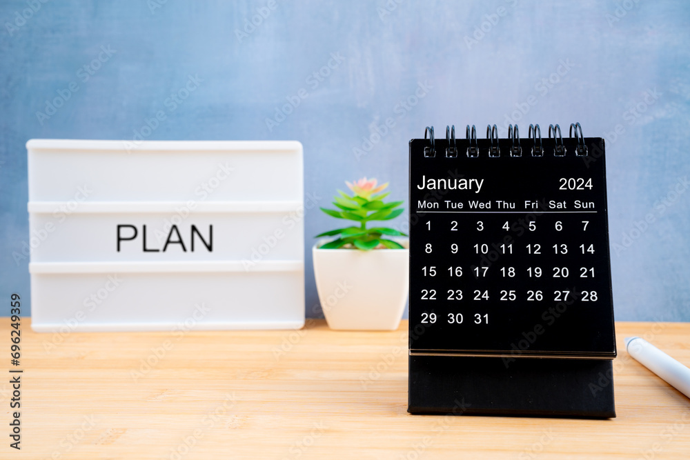 January 2024 black color desk calendar on wooden table with Lightbox displaying