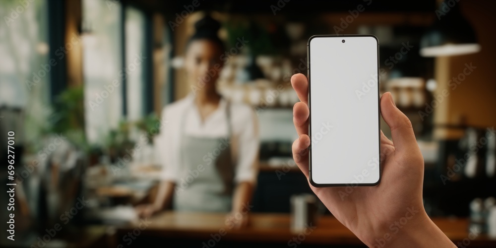 Man using his smartphone in the cafe. Online banking, card wallet application