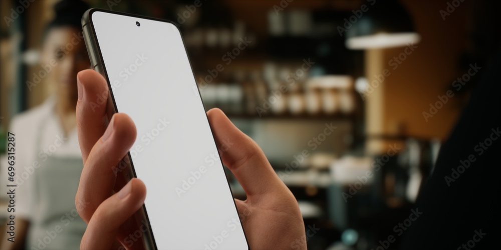 Man using his smartphone in the cafe. Online banking, card wallet application