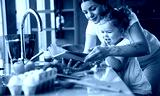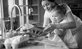 Holding book with recipe. Mother with her daughter are preparing food on the kitchen