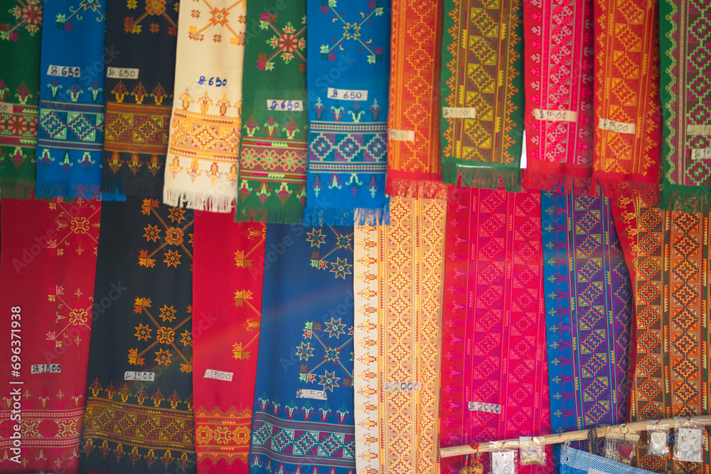 Colorful vintage Thai fabric pattern surface texture. Close-up of clothes material for design decoration background. Handcraft