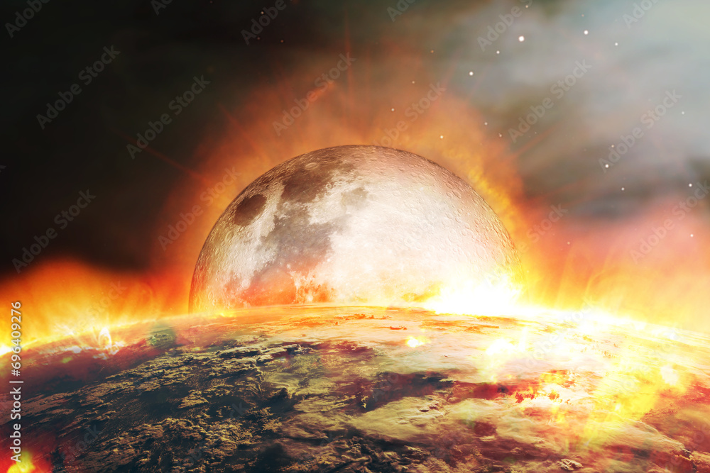 Apocalyptic abstract background with Moon fall and burning Earth . Elements of this image furnished by NASA.